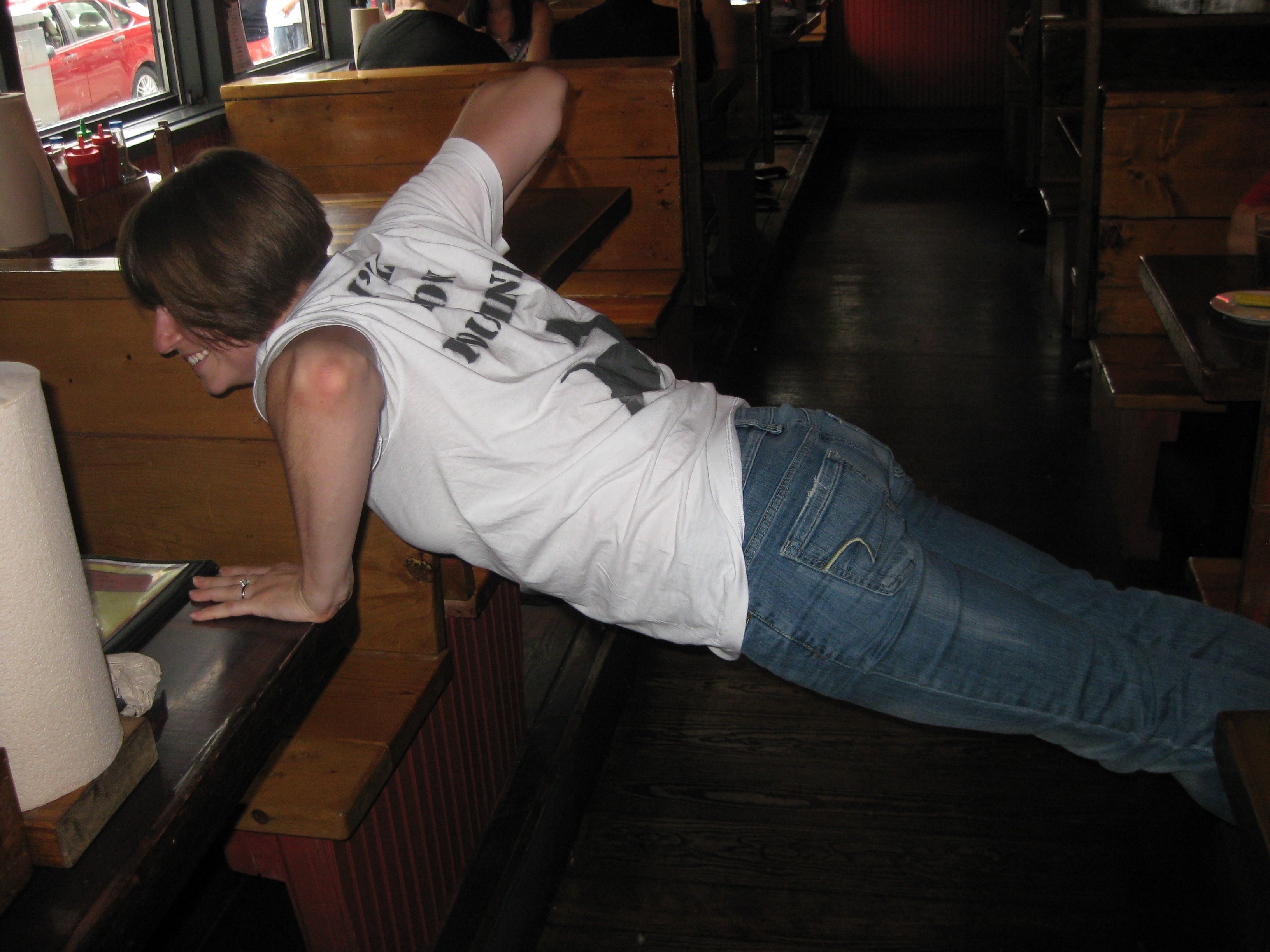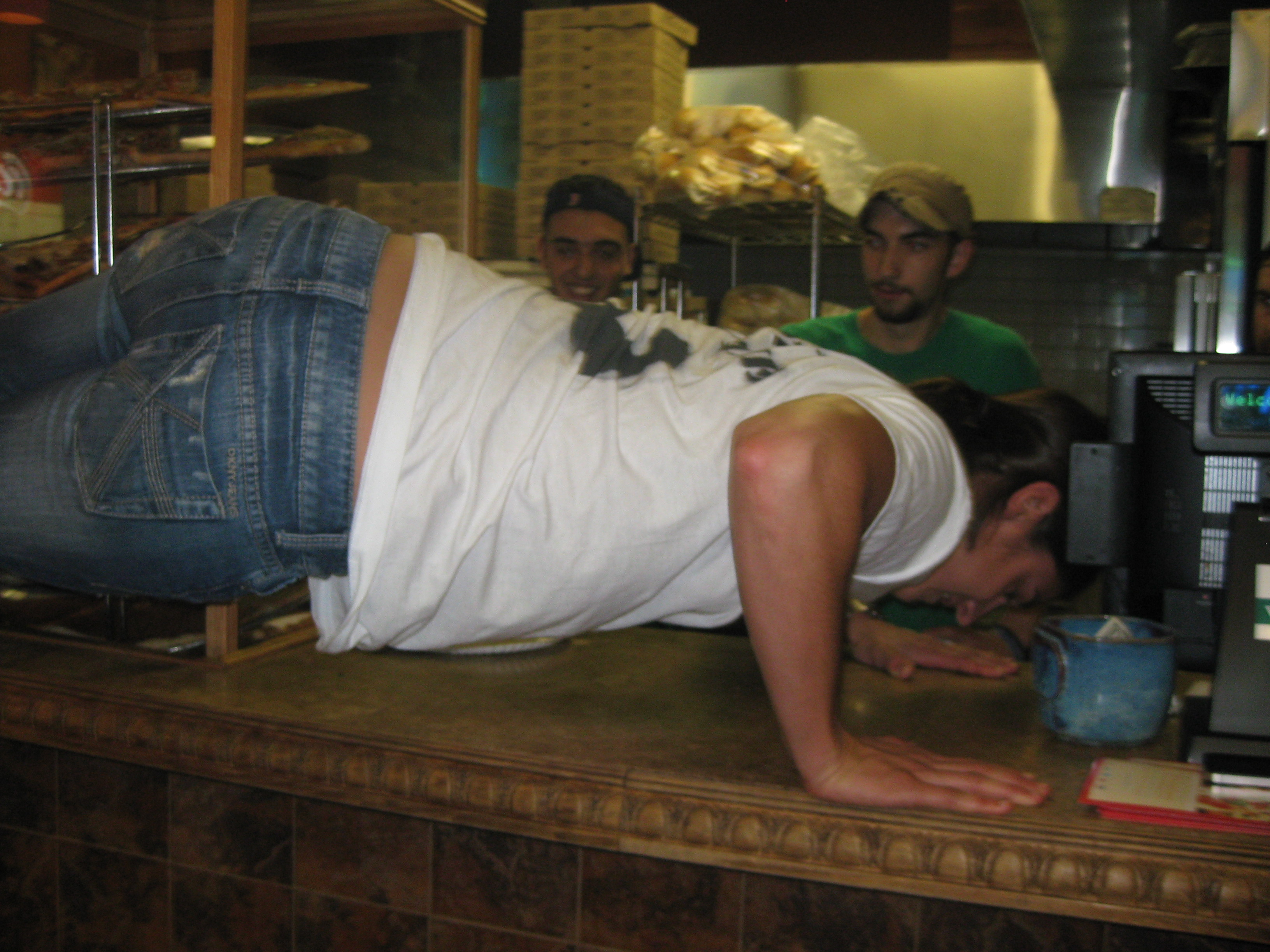 And the last push up of the night….on a pizza shop counter. (We did get permission before we attempted this one. The employees were impressed as you can see!) 🙂