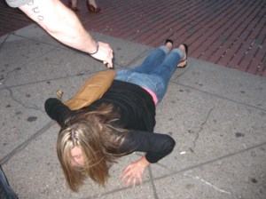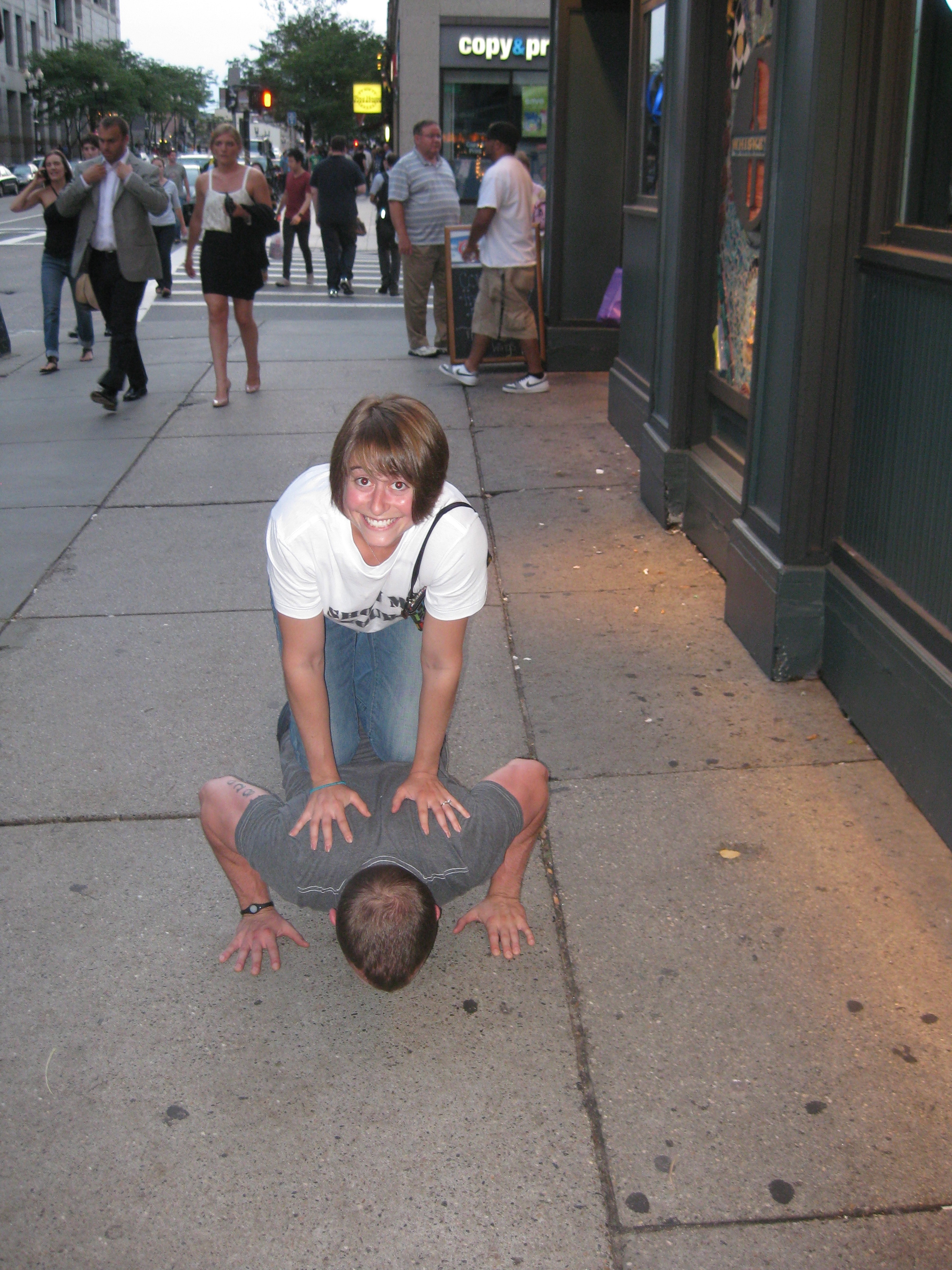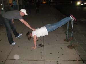 Next we met up with a co-worker who we convinced to do a push up on the street. A homeless woman was so impressed that she walked up and gave Alyson a hug before anyone knew what was going on.