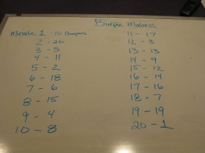 AND the last piece of randomness I would like to include is the Burpee workout Candy and I did the other day. It is 210 burpees in 20 minutes. If for any reason you don’t hit the specified number of burpees in the minute, you must finish the remaining burpees in the next minute, but you can’t move on to the next set of burpees once you’ve finished the specified amount. You must wait until the next minute.