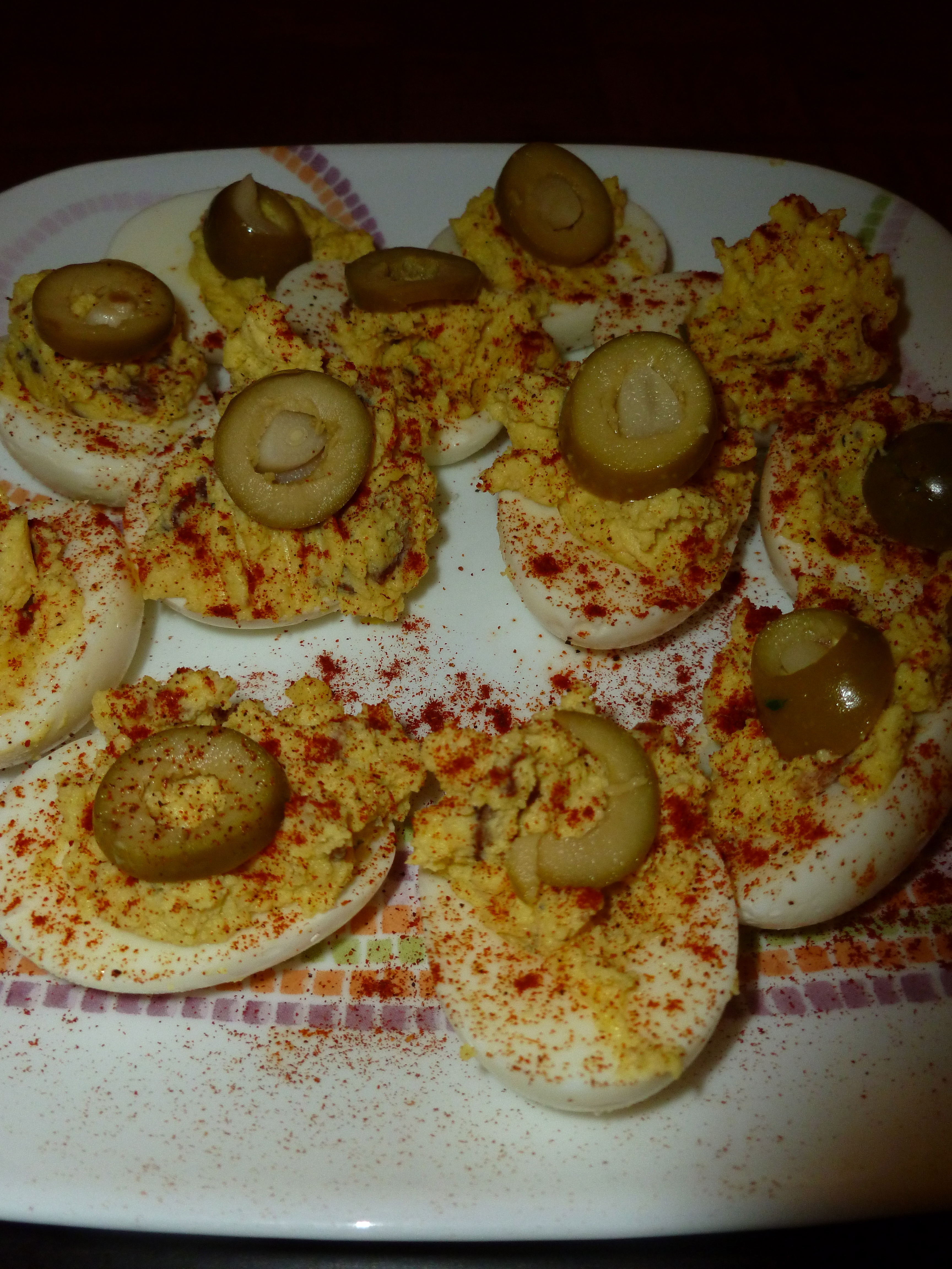 Homemade deviled eggs (cage free eggs, heavy cream, paprika, nitrite-free bacon)