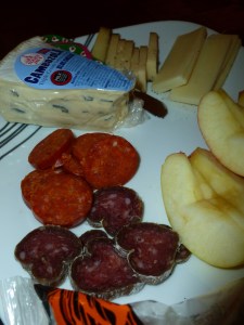 Organic apples, raw milk and grass-fed cheeses and wild boar salami tray