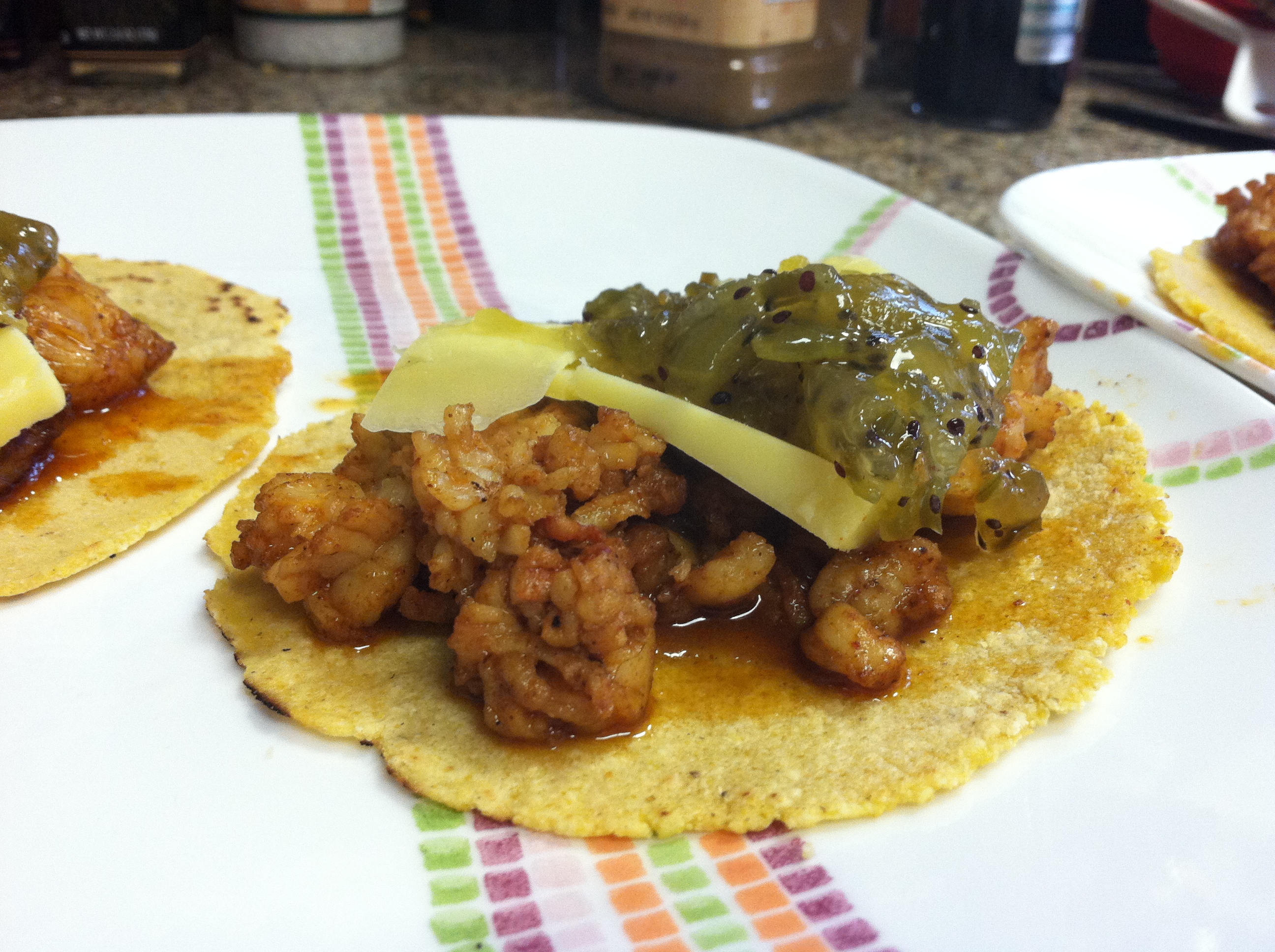 Add bacon-lobster mix to corn tortillas. Top with a few thin slices of grass-fed cheddar and two tsp of kiwi-jalapeno relish.