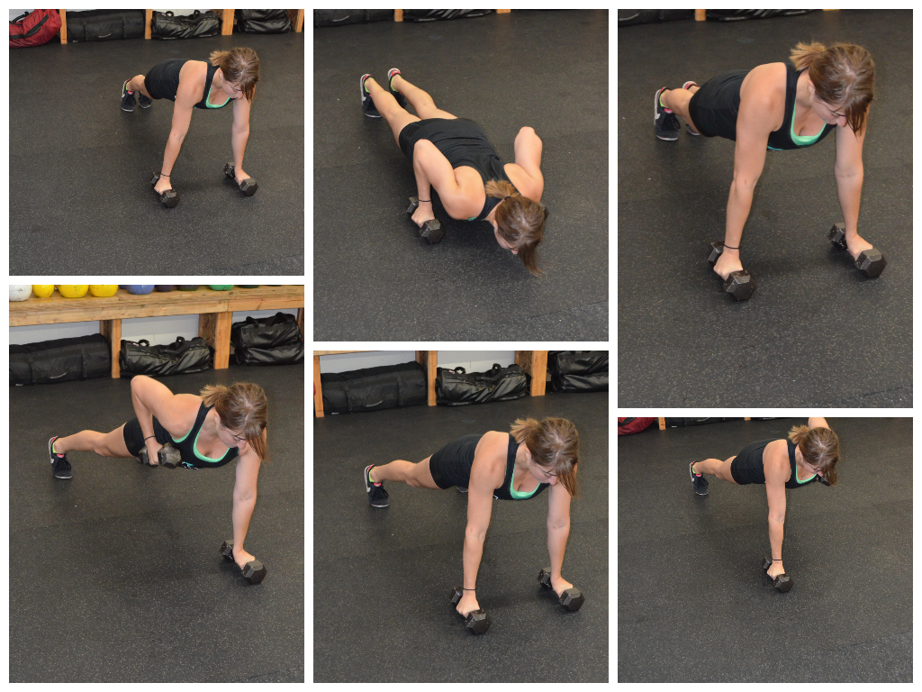 4. Spiderman Push UpΒ – With this move you get in some oblique work as well. Perform a push up. Holding at the bottom of the push up, bring one knee outside your body toward the same elbow. Then put the foot back and do another push up bringing the foot in on the other side. You can also do both feet in every push up! Could be done on an incline to make it easier although you won’t get as much benefit out of bringing the knee in.