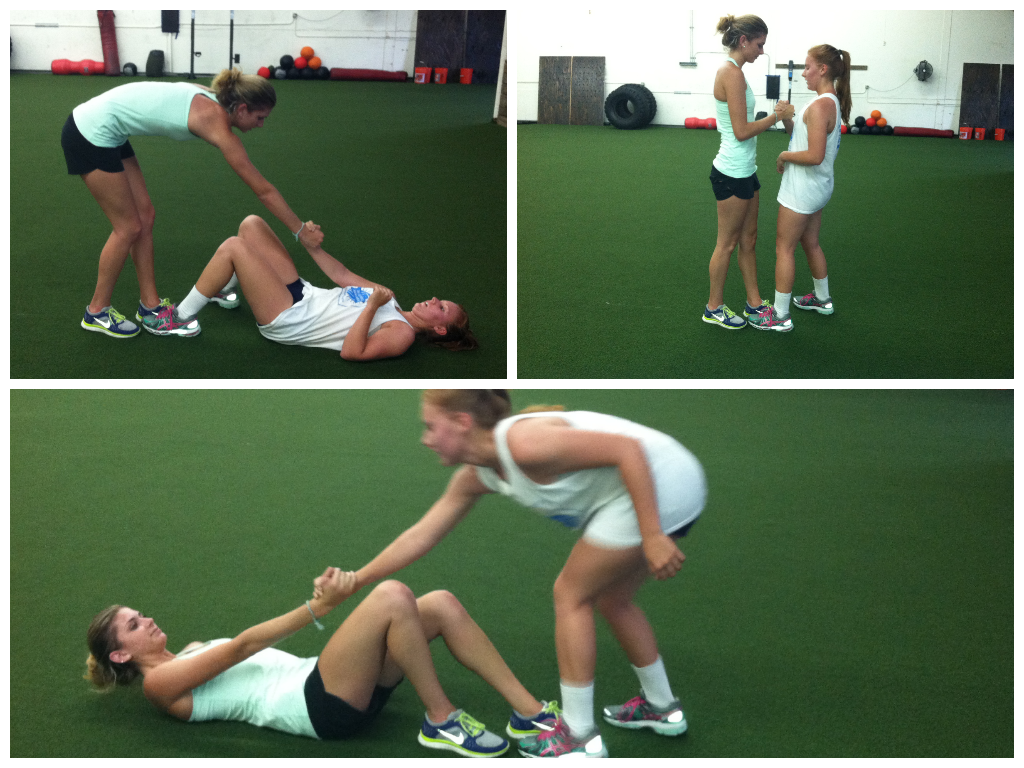 8. Partner Medball Sit Ups and Throw – Take a light medicine ball. One partner will be standing while the other is on the ground performing a sit up. The partner on the ground should bend their knees and lay back on the ground with the ball extended overhead. As they sit up, they are going to throw the ball to the partner that is standing. The partner standing will then pass the ball back to the partner that is seated and then will lie back down and repeat. Switch once the time or reps are completed.
