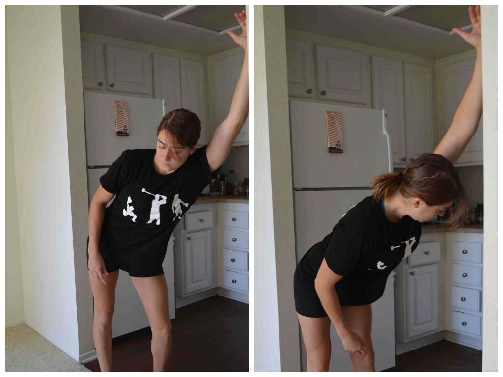 1. 3 Way Neck Stretch – Bend your elbow and reach one hand behind your back. Then grab that wrist with the other hand. Pull the arm behind your back toward the opposite side. You want to create a “chicken wing” with the arm that is pulling. Then lean your head to the side you are pulling to. Do not tense your shoulders and bring them up toward you ears. Relax into the stretch. Start by looking straight ahead. Then look up and hold for a second or two. Then look back straight ahead. And then look down. Move your chin as you look and not just your eyes. Changing the direction of where you look, will change exactly which muscles in your neck and upper back that you stretch.