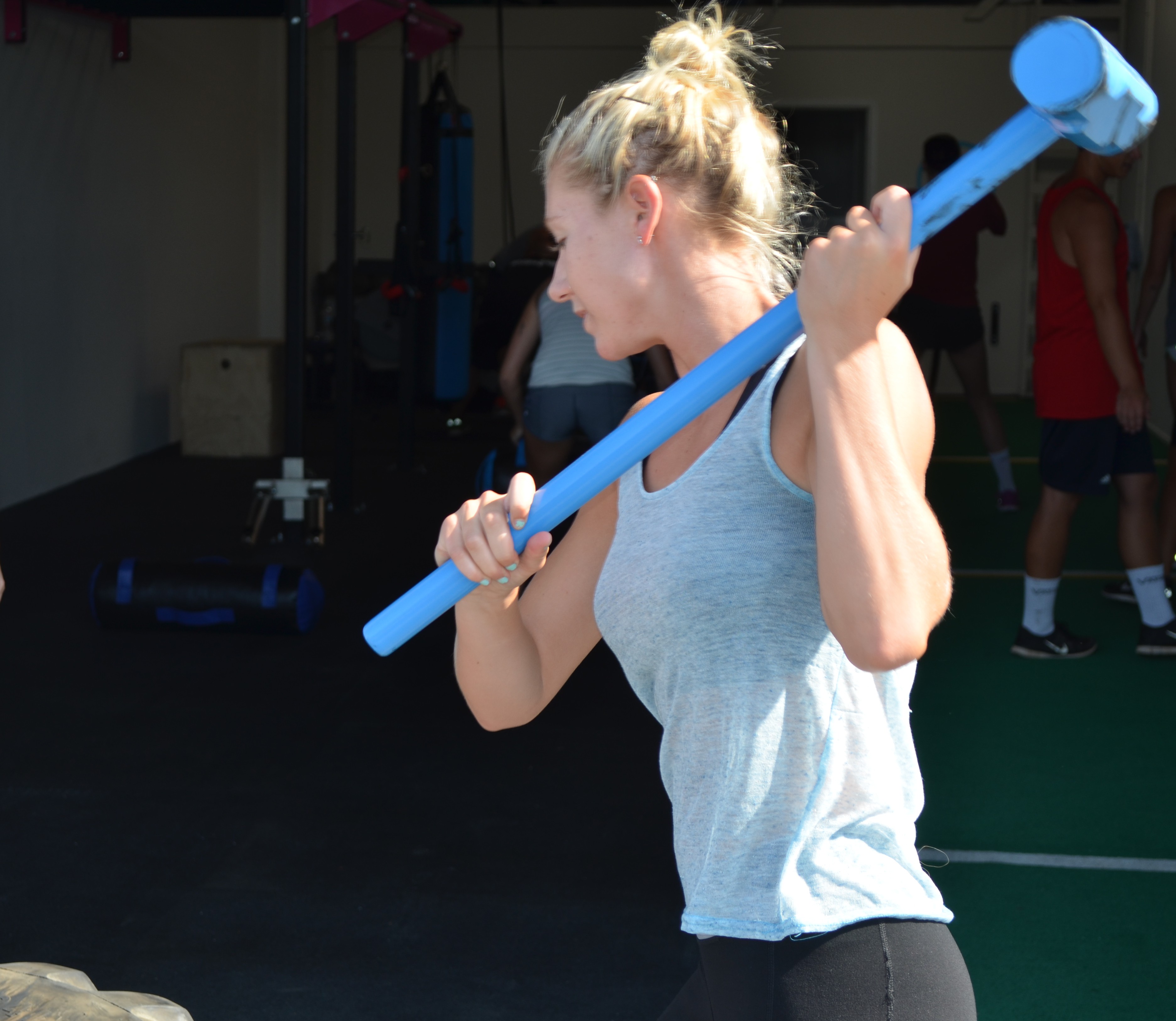 We use battling ropes, sandbags, slam bagz, monkey bars, climbing ropes, sledgehammers, tires, kettlebells, sliders, slide boards, rowers, pulley systems, resistance bands, barbells, landmines, dip bars, pull up bars, sleds….And so much more in our training.