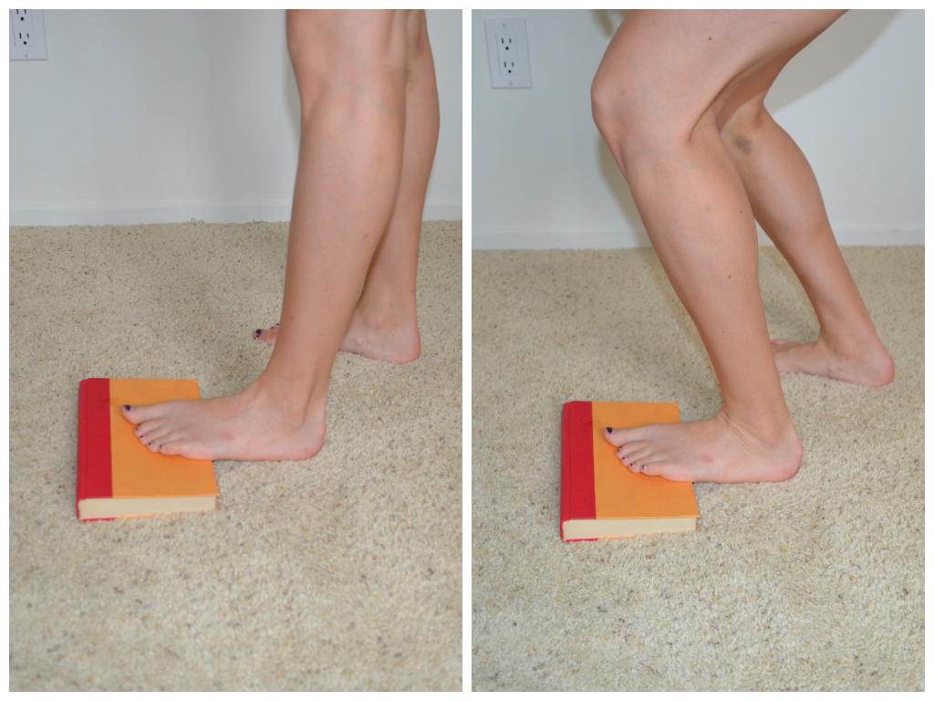 7. Elevated Toe Standing Dorsiflexion (foot “flexed”)- This is a great one for anyone with knee issues. Elevate your toes on books or plate weights or anything that is an inch or two higher than the ground. Place your toes up on the book and your heel on the ground. Then “squat” down a bit keeping your heels on the ground. You may sort of go forward instead of truly squatting down when doing this move. Just make sure to keep your heel on the ground. This move creates ankle dorsiflexion without you having to let the knee go over the toe.