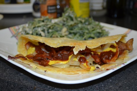 So I made this hot dog with a parmesan crisp bun, but next time I would put the salad in the crisp and wrap the dog in lettuce.