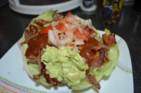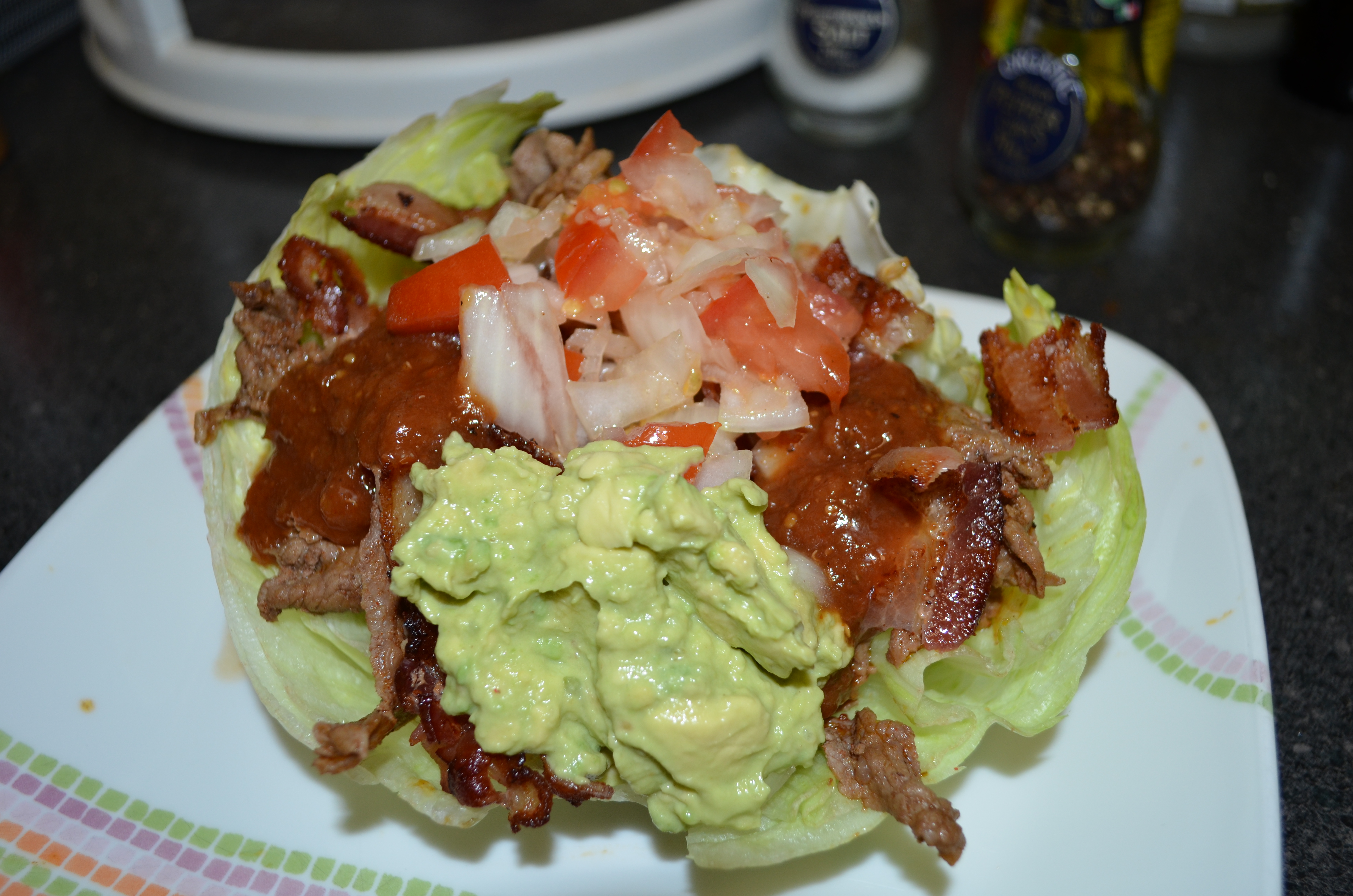 Place lettuce leaves on plate to make a “bowl.” Top with shaved steak, chopped bacon, pico de gallo, guacamole and some of your favorite red salsa. YUM!