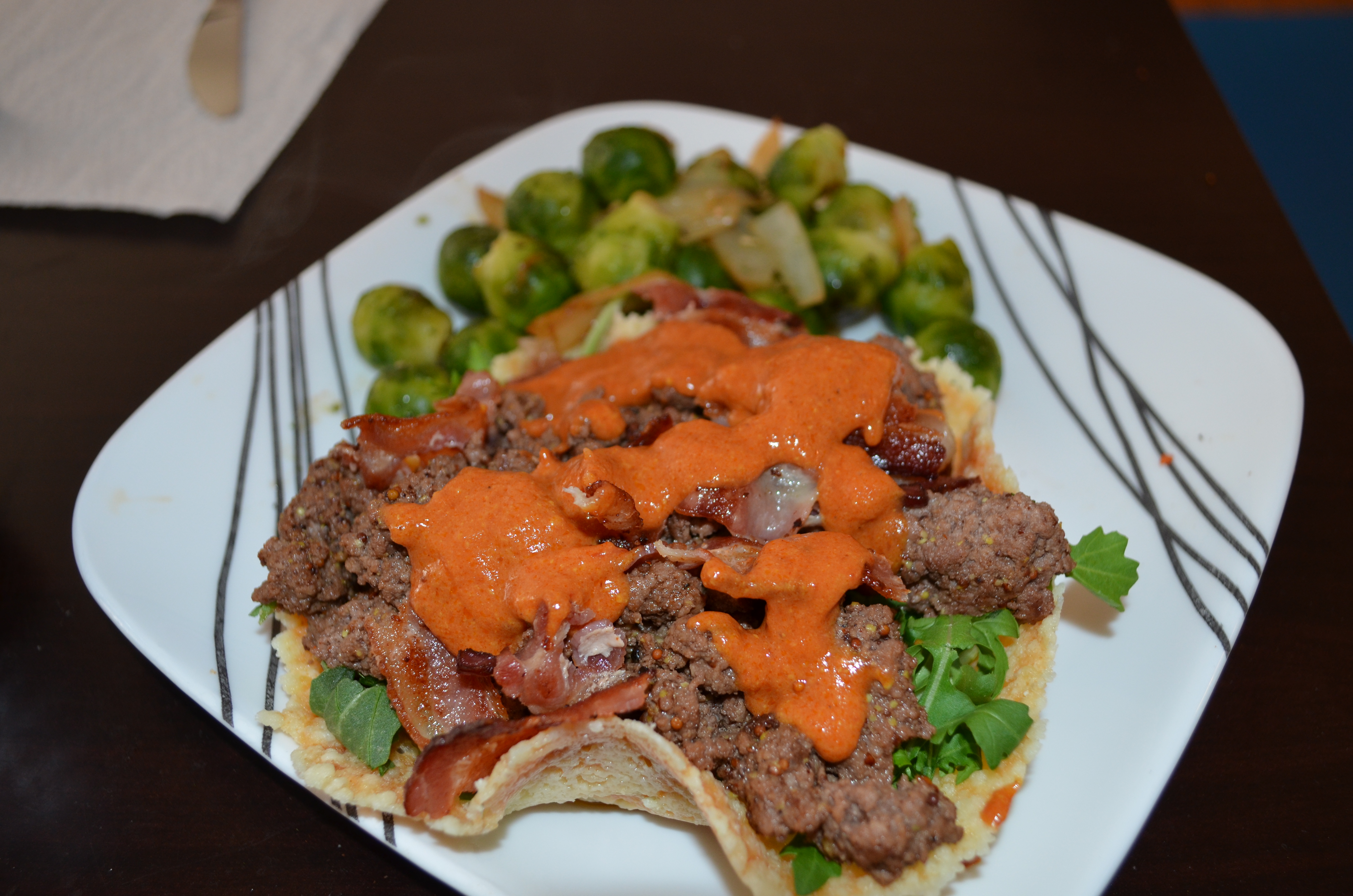 I served this deconstructed bacon cheeseburger with brussel sprouts and onions cooked in grass-fed butter.