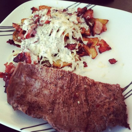 My dinner tonight – Free roaming, grass-fed buffalo flank steak and “loaded” potatoes (nitrite free bacon, grass-fed cheese and a primal “ranch” sauce!