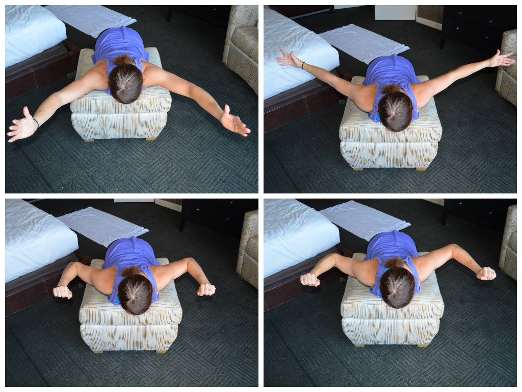 8. YTWLs – I show this move on a little foot stool, but it can be done on a bed or even from the ground if your room doesn’t have a foot stool. YTWLs are a great way to work your upper back and even strengthen your rotator cuff muscles. There are four different arm positions with this move. I complete all reps of one motion before moving on to the next. Lay on the ground or over a stool. Keep your low back relaxed. You want to feel this in your upper back behind your shoulders and in between your shoulder blades. None of these are really big movements. To do a Y, your thumbs should be pointing toward the ceiling and your arms should be above your head in the shape of a Y with your body. Lift up, using the muscles in your upper back. To do a T, have your thumbs pointing up toward the ceiling. Your arms should make a T with your body. If you are doing this on the ground, you are really only going to lift an inch or two off the ground. Over a bench or stool, you may be able to relax further down. To do a W, bend your elbows to create a W with your body. Your thumbs should be pointing in toward you. Lift and lower. The final move, the L, will be done two different ways depending on where you do it. If you are lying on the ground, you will set up with your elbows bent to 90 degrees and your elbows in line with your shoulders. Palms facing the ground, try to rotate the backs of your hands toward your toes. Then relax. If you are doing this from a stool or bench, you will actually start with your arms handing toward the ground. You will then lift your arms, bending your elbows to 90 degrees. Finally, keeping the elbows bent, you will rotate the backs of your palms toward the ceiling. None of these moves involve a big range of motion. Do not rush through the movements. (Unfortunately because of the angle, which I didn’t notice at the time, you can’t fully see the angle of my elbows especially during the Ls. Sorry!)