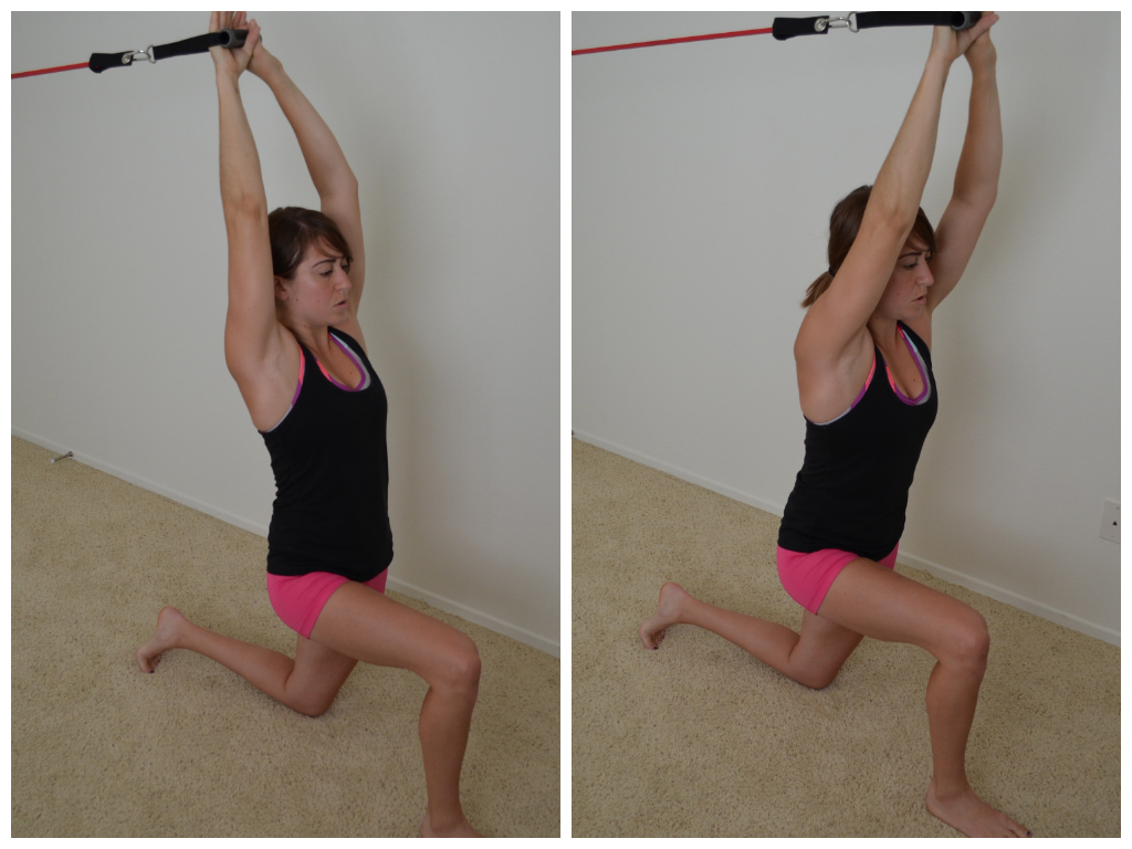 9. Band Reach – So this is the move that works the body in a similar way to the ab roller. It reminds me of that extension at the top of an overhead medball slam. It helps strengthen that extension so that your core is strong at that range of motion and so that your lats are even working to help stabilize and generate power. Kneeling, allow the band to pull you back. Then using your lats and core, press the band back forward. It isn’t a huge range of motion, but you will feel your abs working to stabilize especially as you allow yourself to be pulled back!