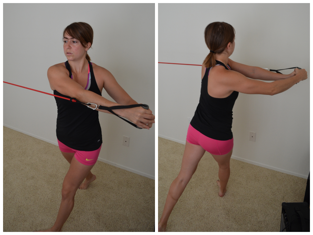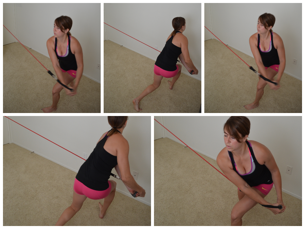 8. Band Rotations (Shoulder to Shoulder and High to Low) – These were some of my favorite moves in college. We used to do them a lot with medicine balls, which I loved. But since I can’t slam a medicine ball into the wall of my house….I do these with bands. Keeping your core tight and your shoulders down and back, rotate the band from side to side keeping your arms fairly straight. You can either rotate side to side at shoulder height or you can rotate the band down outside your hip. With both, make sure to rotate the back foot so that you are twisting your knee in a funny direction. With pulling the band down outside your hip, you will want to get more of a squat/lunge in than you will with the shoulder height rotation. Both are great, just different variations that target slightly different muscles.