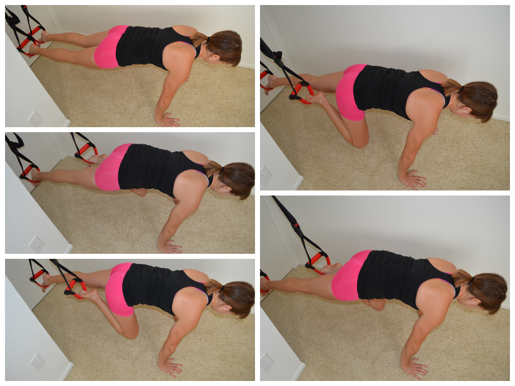 4. Rotational Knee Tucks – These knee tucks can also be done as straight leg pikes, but for today I just showed the tucks. Like mountain climbers, they can also be done where you just bring your knees straight into your chest. However, they are a great rotational move so that is the one I showed today. Set up in a high plank with your feet in the straps. Alternate bringing your knees to each elbow. Try to really get the knees to the elbow or outside to really work the rotation. If you are a beginner, you may want to do this move on the ground by jumping your feet in and back. You can also do this move on the towels!