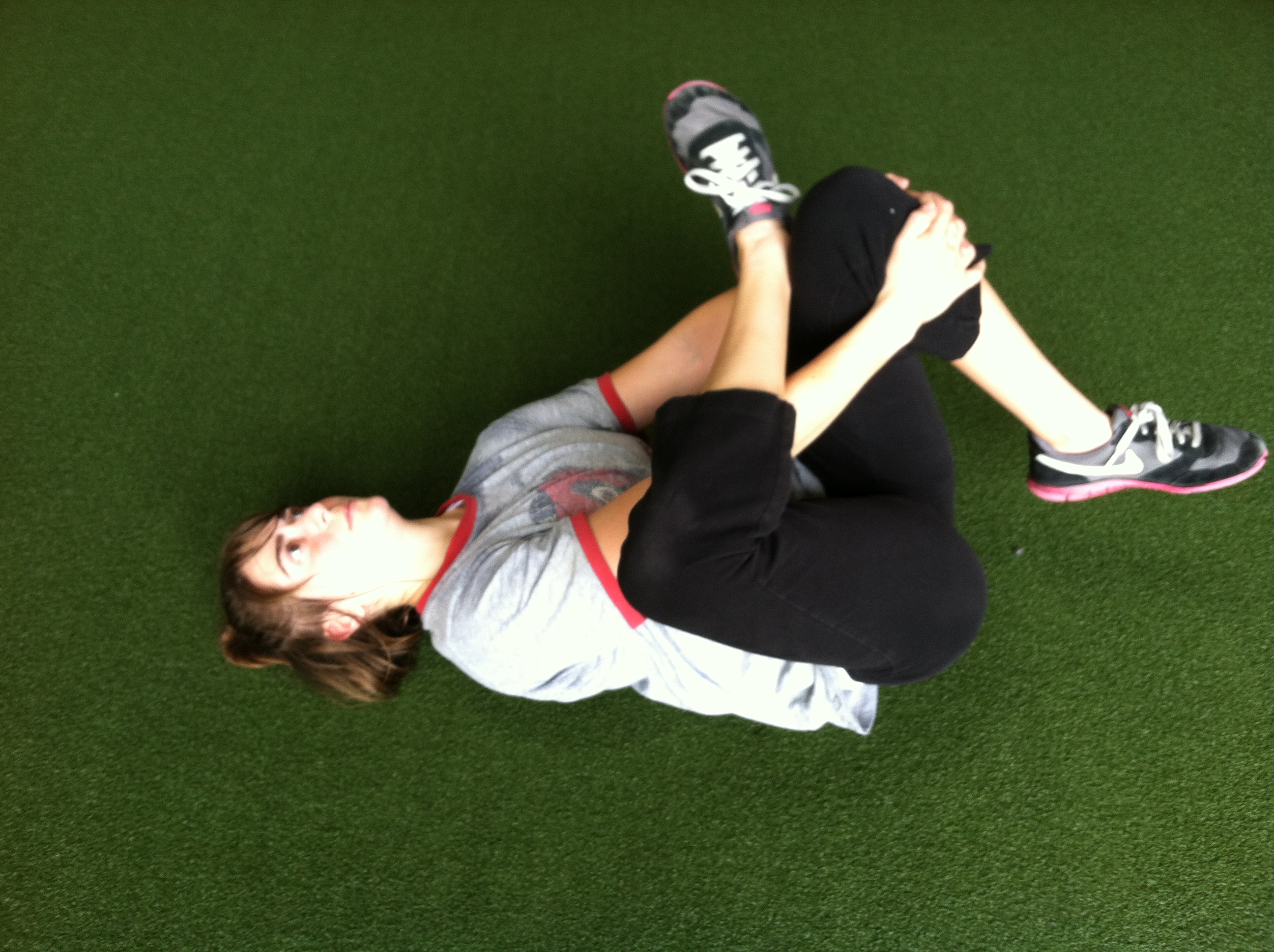 - Lying glute stretch – Lay on your back with your right knee bent and foot flat on the ground. Cross the left ankle over the right knee. Then grab behind either your right hamstring or in front of your right shin. Pull the right leg with the left foot across it unto your chest and then release. You should feel that in your glute. This stretch will make sure you are loose all around the hip joint! (I love doing the pigeon pose after my workouts as my static stretch!)
