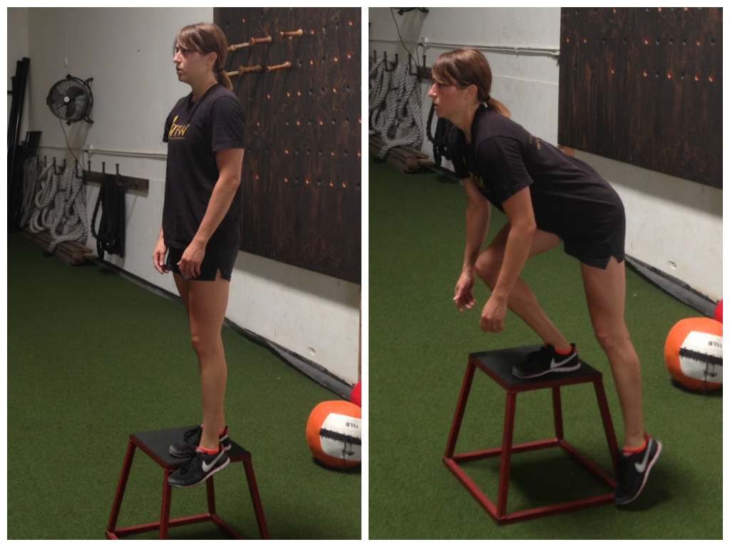 (Start standing on the box as if doing a lateral step up. Step down to the side of the box, hinging over a bit as you lower down. Lower down slowly. Do not let the foot going down fully touch the ground. Only let the toe lightly graze the ground and then press quickly back up to standing. Only go as low as you can control. DO NOT push back up off the ground!! The higher the box the harder the move.)