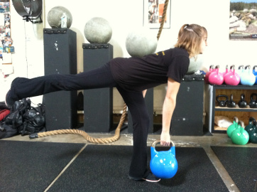 (Increase weight with each round if possible unless 8 rep max hit. Keep standing leg slightly bent and back flat as you hinge over. Hold one kettlebell in each hand by your side. Do not let your back round as you hinge over.)