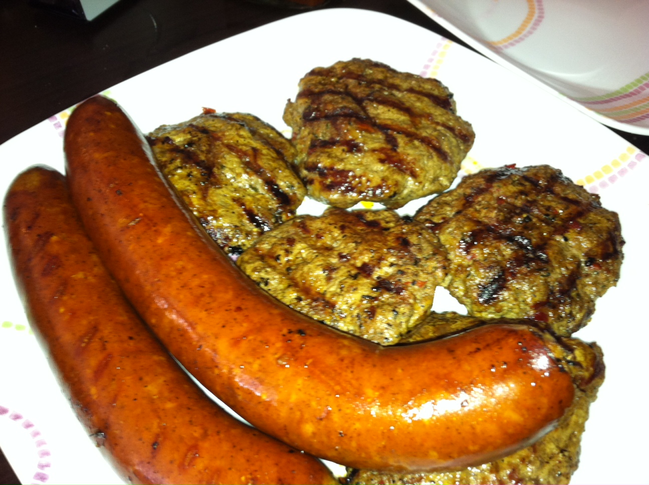 Lamb Merguez Bunless Burgers and Kielbasa with a Bacon-Blue Cheese Ketchup