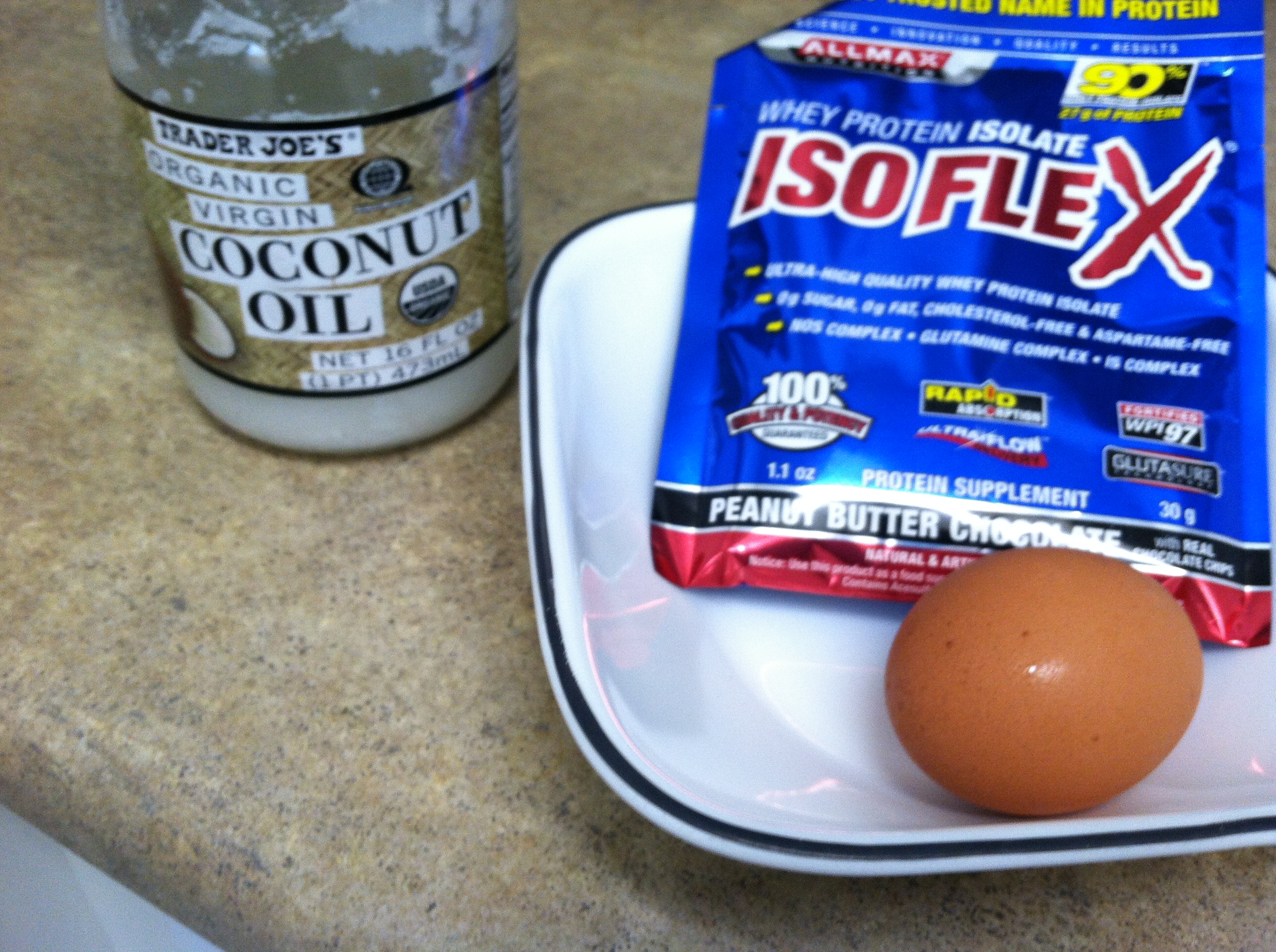 Mix egg, protein, milk and water to desired consistency. Cook with 1 tsp coconut oil over medium/low heat. Cook about 1-2 minutes per side.