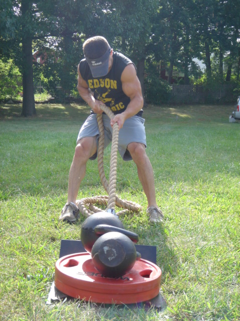 Tonight Ryan came in to the gym for a workout and I started our workout out with a sled pull (pull the sled toward you by pulling a long rope in) and then pushing it back to the starting position. (This was made even more torturous by the fact that you then had to bear crawl backwards back to the beginning.)