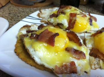 Once you remove the tortillas, cook the eggs in the remaining grease. Once eggs are cooked to your liking, place on top of the beans. Top the eggs with bacon pieces and some cheddar cheese.
