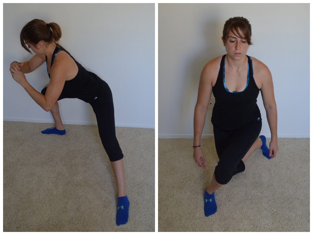 2. Balance Lunges – The balance lunge is a great leg move to do if you don’t have weights. Place your back foot up on the table and hop your front foot out so you are in a nice wide stance. Then lunge down, dropping your back knee toward the ground. Really sit back into the lunge. Make sure you aren’t going forward and that your front knee is not going past your toe. You should feel a nice stretch in the front of the leg that is back when doing this move.