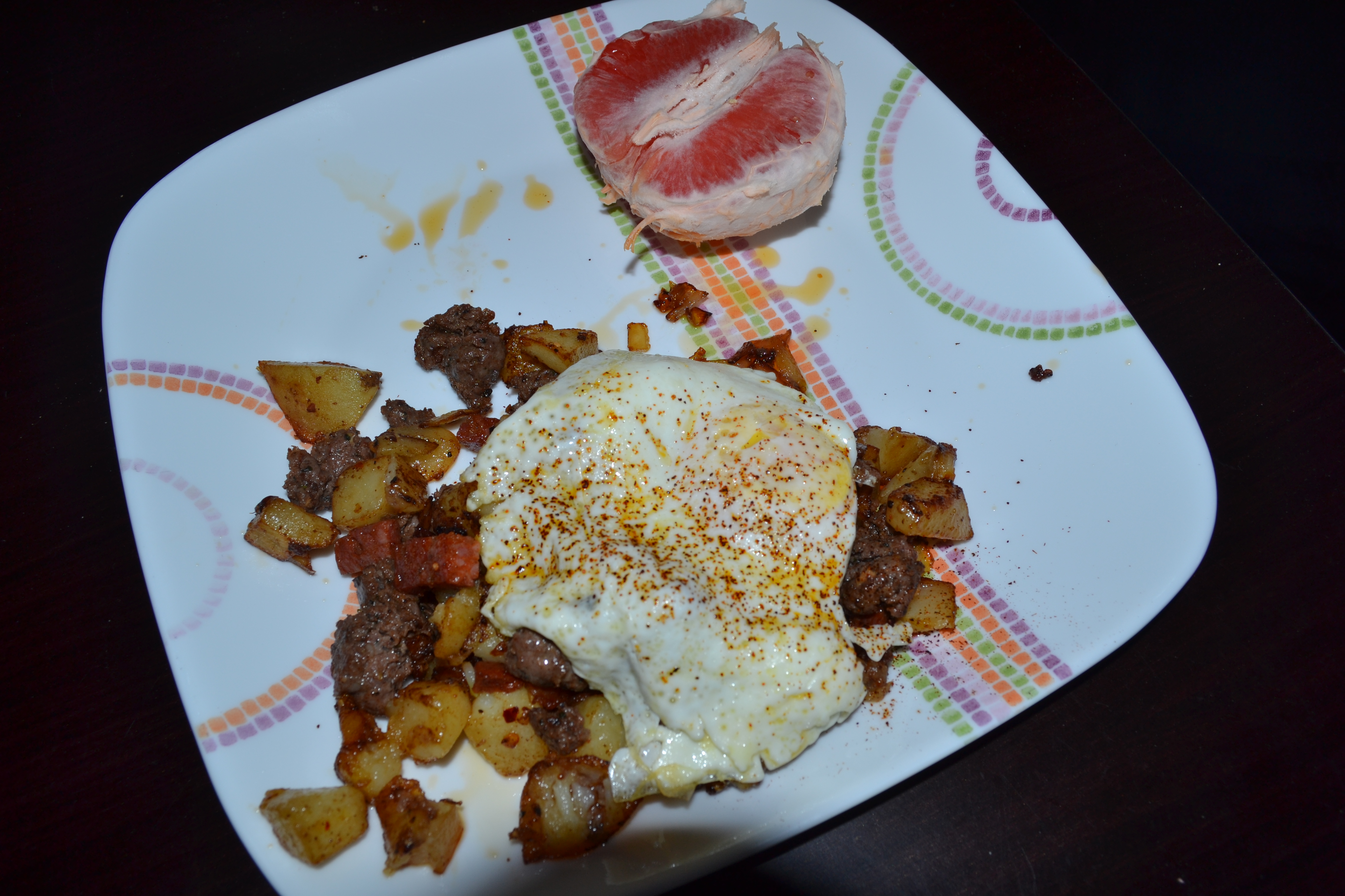 Once mixture is cooked, divide onto plates. Cook eggs in grass-fed butter and place over breakfast potatoes. Sprinkle with salt, pepper and chili powder.