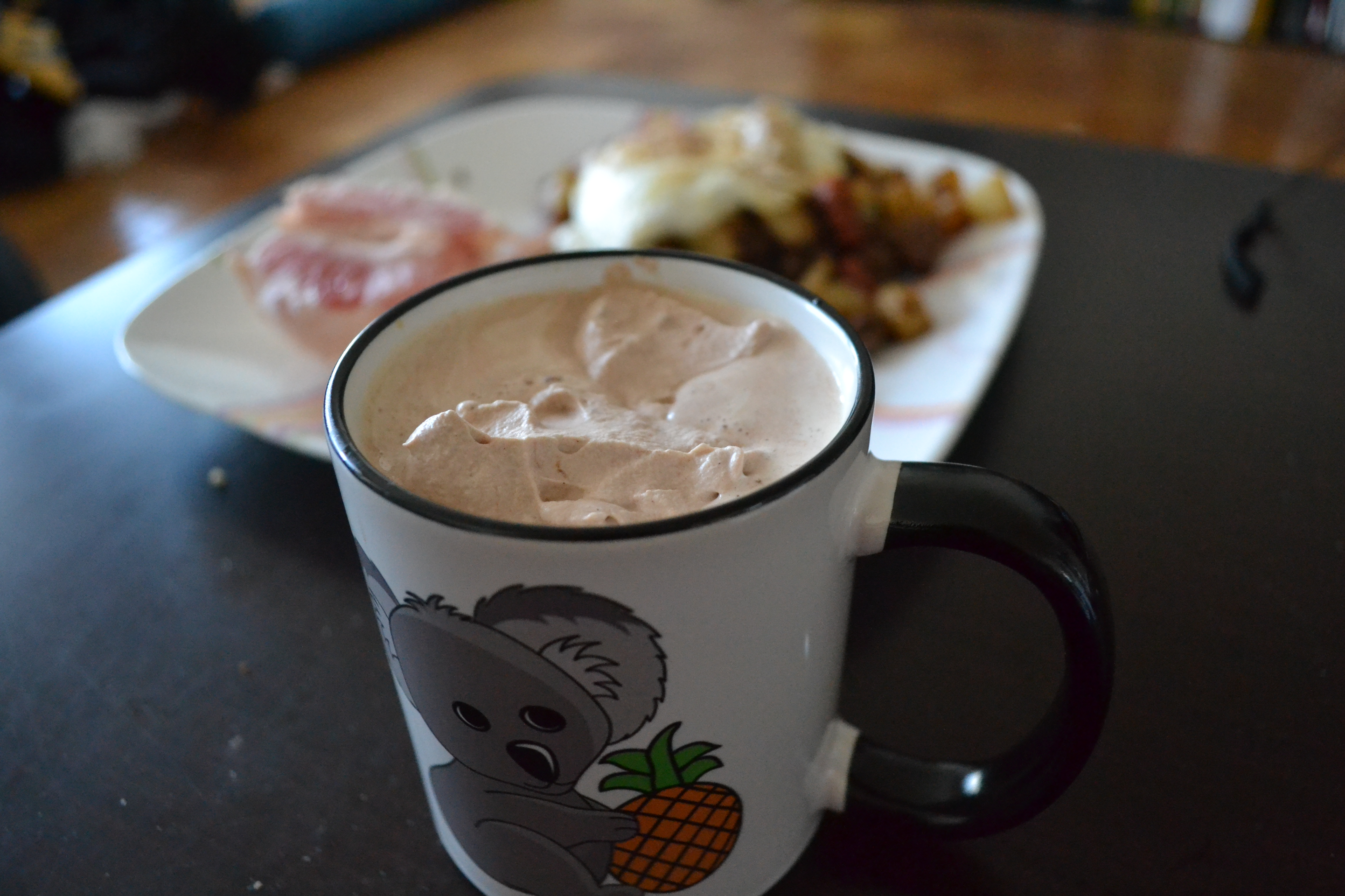 Chocolate coconut whipped cream in a mug Ryan made for me with some delicious breakfast potatoes and grapefruit!
